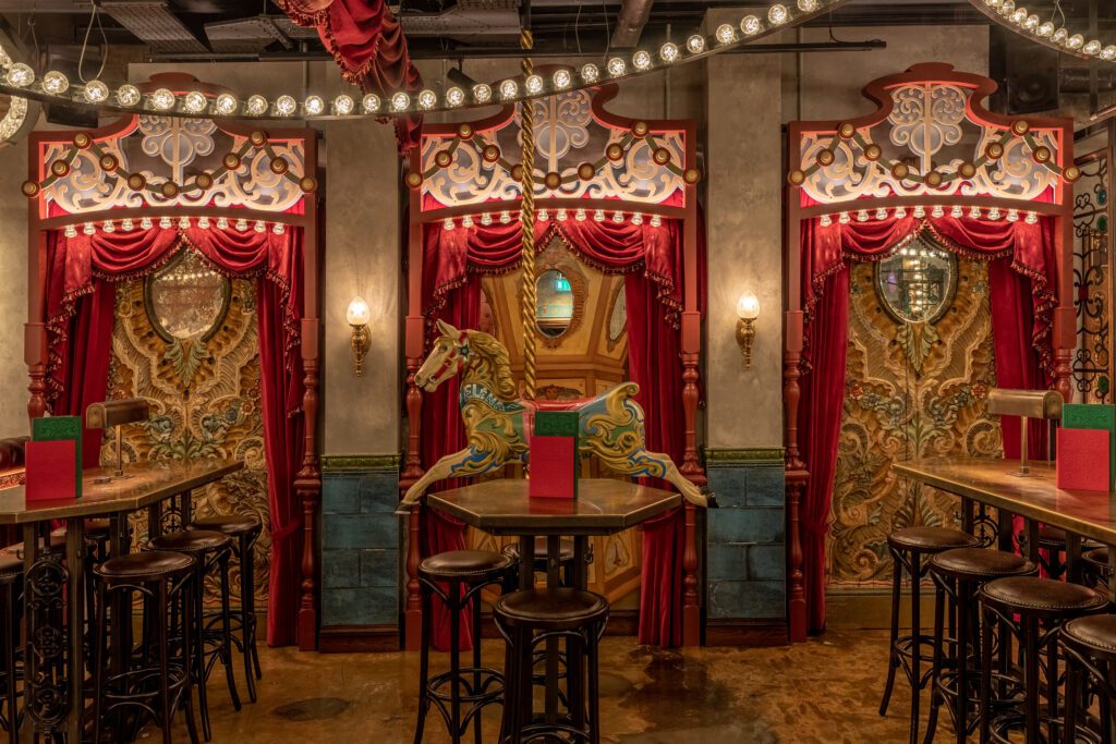 Each Flight Club has an individual design, however the beautiful theme running through them all is similar to a Victorian style fairground, lots of colours, texture, patterns and lights.